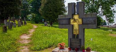 Obnovené pozůstatky zbořeného kostela sv. Martina a pietně upravený zničený hřbitov